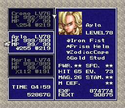 Ayla is chief of the village in 65,000,000 B.C. She meets up with Crono when they go there to search for the Dreamstone. She has great attack power, but only fights with her fists, so she has no weapons. She cannot use magic, but her Techs are still very powerful, especially those in which she attacks with another character.